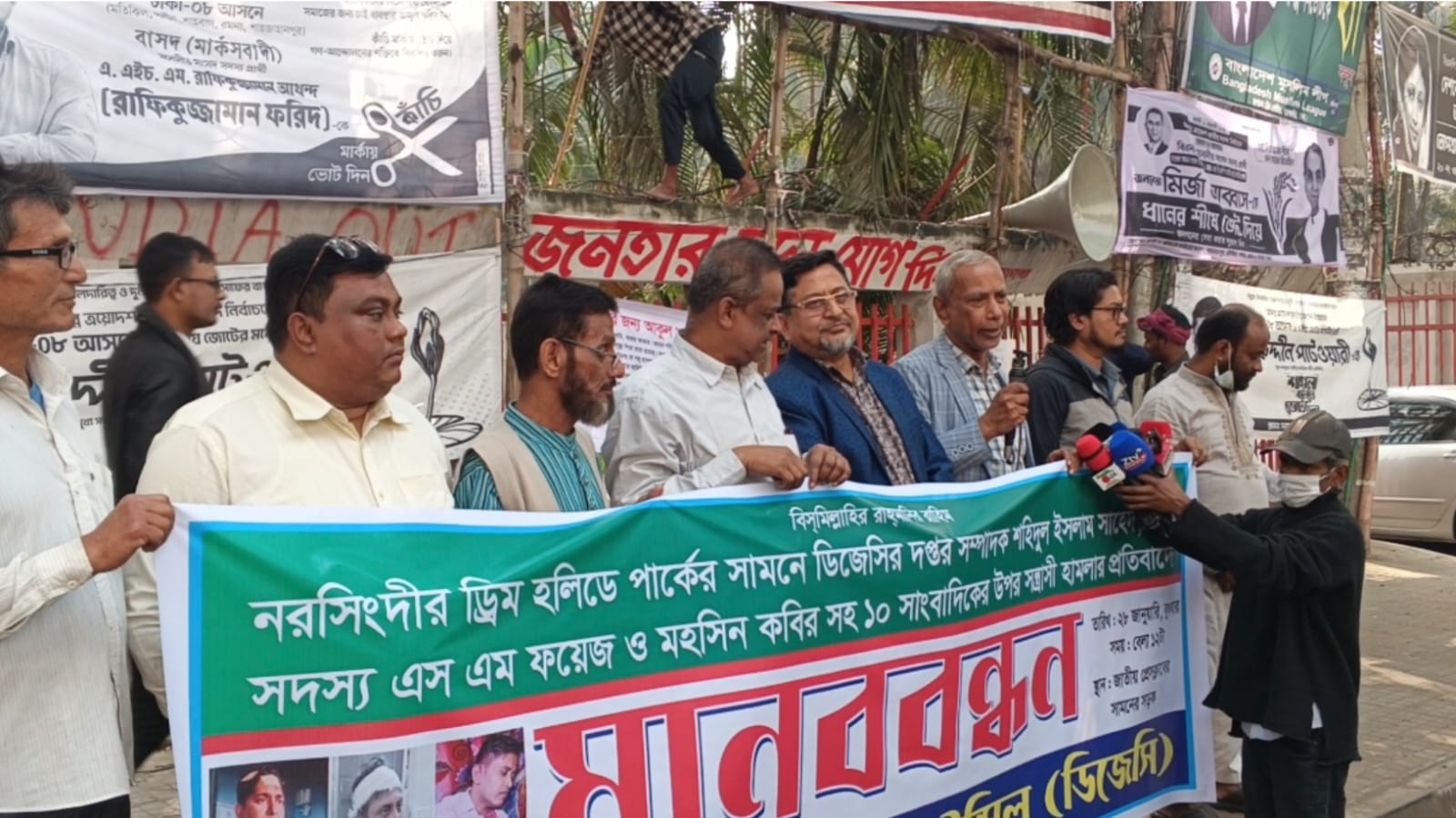 চাঁদাবাজ সন্ত্রাসীদের হামলার প্রতিবাদে ঢাকা প্রেস ক্লাবের সামনে মানববন্ধনের আয়োজন করেছে ঢাকা জার্নালিস্ট কাউন্সিল (ডিজেসি)।