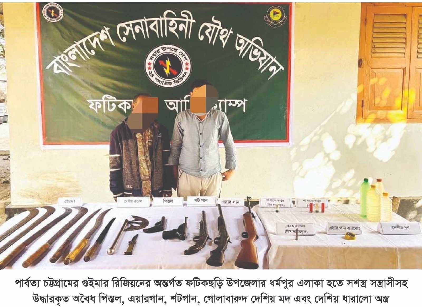 ঢাকা, ২৮ জানুয়ারি ২০২৬ (বুধবার): চট্টগ্রামের ফটিকছড়ি উপজেলার ধর্মপুর এলাকায় বাংলাদেশ সেনাবাহিনী সম্প্রতি একটি যৌথ অভিযান পরিচালনা করে। অভিযানে উদ্ধার করা হয় ২টি শটগান, ১টি পিস্তল, ১টি এয়ার গান, ১টি ডামি পিস্তল, ১ রাউন্ড .৩০৩ ক্যালিবারের গোলাবারুদ, ১ রাউন্ড শটগানের গোলাবারুদ, ৩ রাউন্ড ফায়ারকৃত শটগানের কার্তুজ, ৫টি ধারালো দা, ১টি বিদেশি চাকু, ১টি ড্যাগার এবং ৪ লিটার দেশীয় মদ।অভিযানে দুইজনকে গ্রেপ্তার করা হয়েছে। বাংলাদেশ সেনাবাহিনী সর্বদা সর্বসাধারণের নিরাপত্তা নিশ্চিত করতে বদ্ধপরিকর। জনগণকে অনুরোধ করা হচ্ছে, কোনো অপরাধমূলক কর্মকাণ্ডের তথ্য থাকলে তা নিকটস্থ সেনা ক্যাম্প বা আইন-শৃঙ্খলা বাহিনীর সঙ্গে শেয়ার করার জন্য।